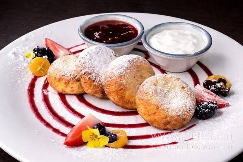 Сирники, сметана, джем, цукрова пудра.