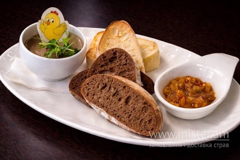 Авторський паштет з курячої печінки, чіабата, соус муштарда з інжиру та родзинок.
