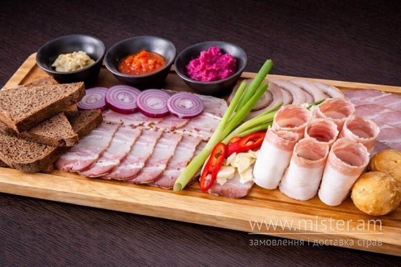 Асорті Вінницького сала, часник, аджика, цибуля, грінки.