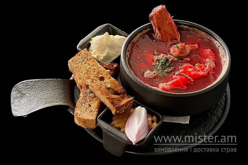 Телятина, свинина, підчеревина, білі гриби, картопля, морква, перець болгарський, цибуля, часник, перець чілі, подається із салом, цибулею ріпчастою та чорним хлібом.
