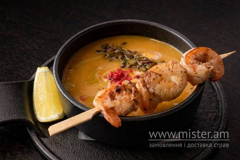 Гарбуз, креветка, гребінці морква, цибуля, кокосове молоко, насіння гарбуза, лимон.
