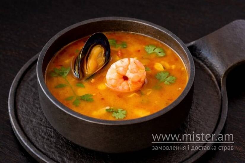 Мідії, тигрова креветка, лосось, помідори черрі, кокосове молоко, паста том-ям, каффір лайм (подається без рису).