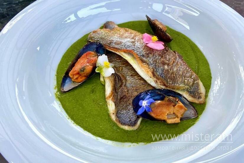 Ніжне філе дорадо в поєднанні з шпинатно-вершковим соусом та мідіям в мушлях.