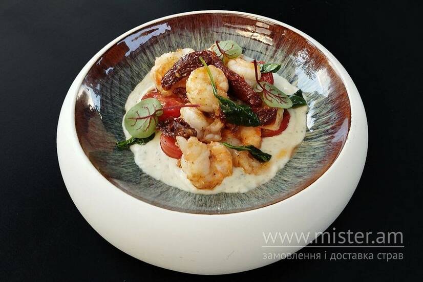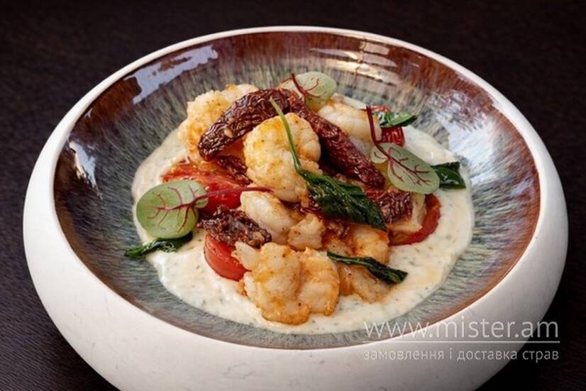 Тигрова креветка з в`яленими томатами у вишуканому соусі дор-блю.