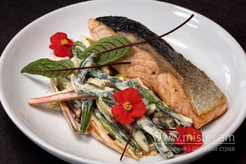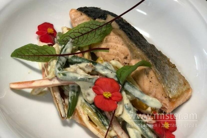 Лосось на подушці з моркви ,болгарського перцю та стручкової квасолі у вершках.