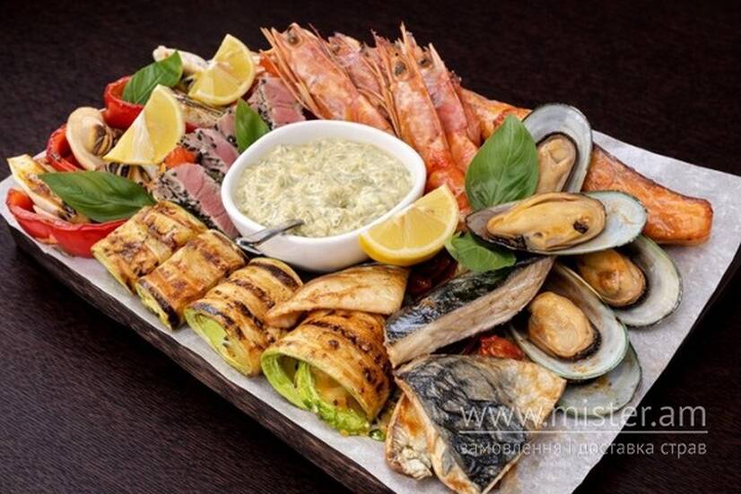 Аргентинські креветки, лосось, філе скумбрії, новозеландські мідії, тунець, цукіні, болгарський перець, порей, соус тар-тар, лимон.