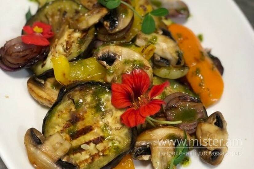 Перець болгарський, кабачки, баклажани, печериці, цибуля.