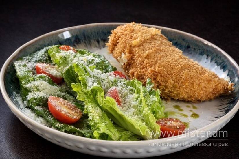 Філе куряче, дорблю, білі гриби, пармезан, ромен, черрі, вершки.