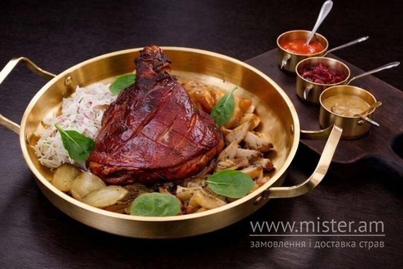 Рулька свинна, картопля запечена, квашена капуста, солоні огірки, гриби ерінги смажені з цибулею, соус аджика, соус гірчиця, соус медово-гірчичний.
