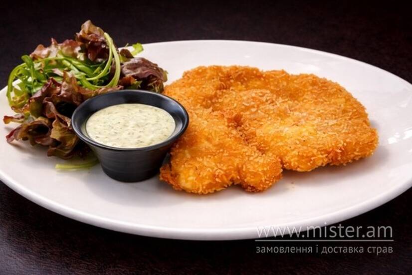 Індичка, яйце, сухарі панко, борошно, сіль, спеції, соус тар-тар, мікс салату.