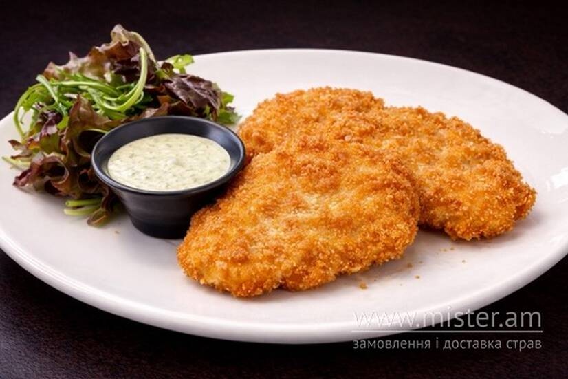Свинина, яйце, сухарі панко, борошно, сіль, спеції, соус тар-тар, мікс салату.