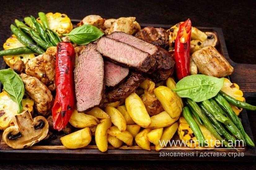 Стейк Нью-Йорк, куряче філе, свиняча вирізка, індичі ковбаски, смажена стрючкова квасоля, картопля по-домашньому, кукурудза в початках, соус Барбекю та медово-гірчичний.