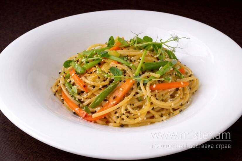 Спагеті, перець болгарський, печериці, морква, стручкова квасоля, цибуля, кунжут, соус унагі.