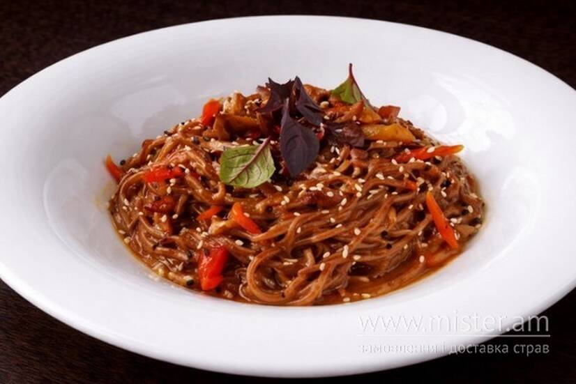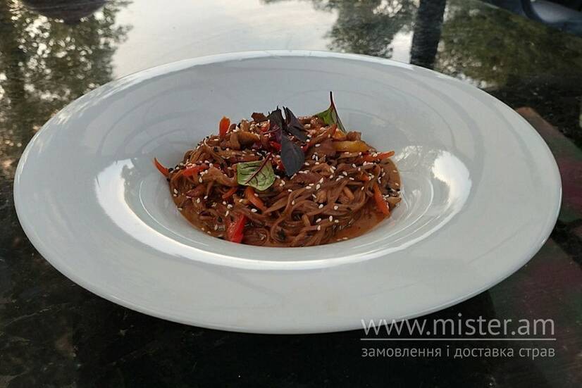 Гречана локшина, телятина, перець болгарський, печериці, морква,цибуля, кунжут, вершки, соєвий соус, унагі.