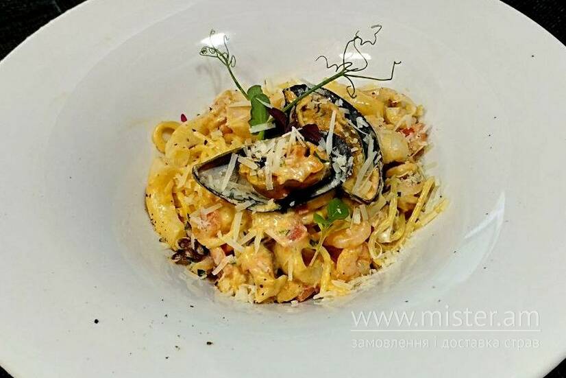 Спагеті, морський коктейль, мідії в панцирі, пармензан, вершки.