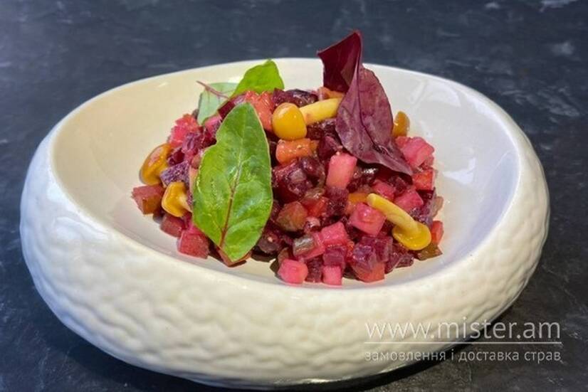Буряк, картопля, морква, квашена капуста, солоні огіркі, зеленогий горошок, мариновані гриби, олія соняшникова, спеції.