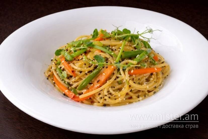 Спагеті, перець болгарський, печериці, морква, стручкова квасоля, цибуля, кунжут, соус унагі.