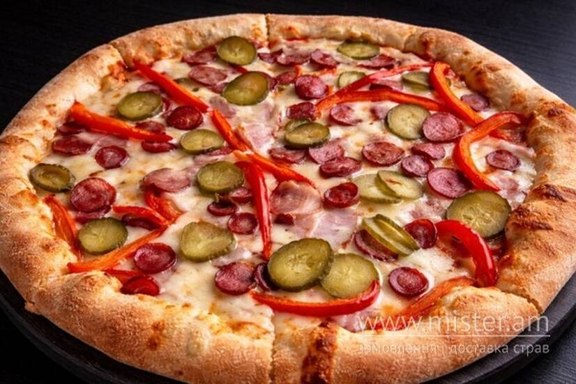 Томатна основа, ковбаски мисливські, перець болгарський, огірки квашені, сир.