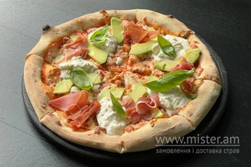 Страчатела, прошутто, авокадо, моцарела, соус пелаті.