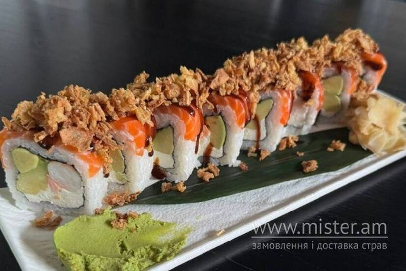Лосось, тигрова креветка, авокадо, крем сир, унагі, цибуля-кранч.