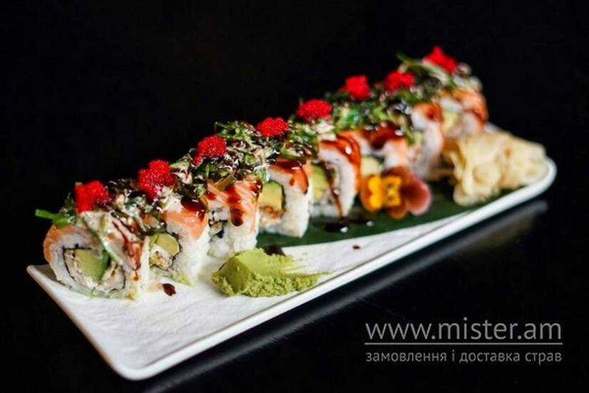Лосось свіжий, вугор, ікра тобіко, авокадо, хіяші, кунжут, горіховий соус, унагі.