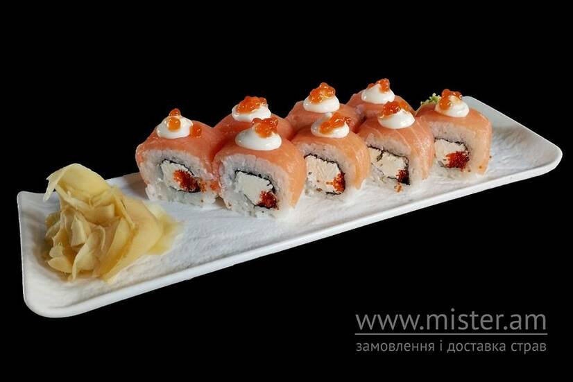 Лосось, сир Філадельфія, ікра тобіко, майонез, червона ікра.