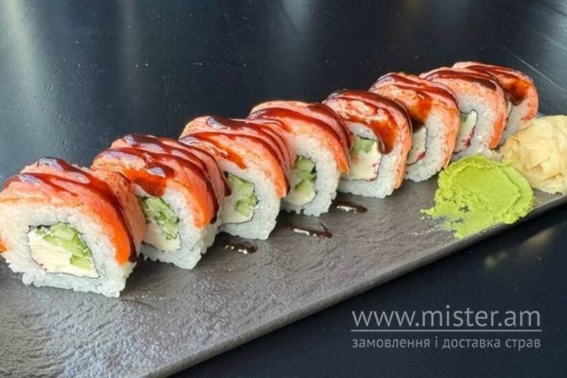 Обсмажений лосось, сир, огірок, ікра тобіко.