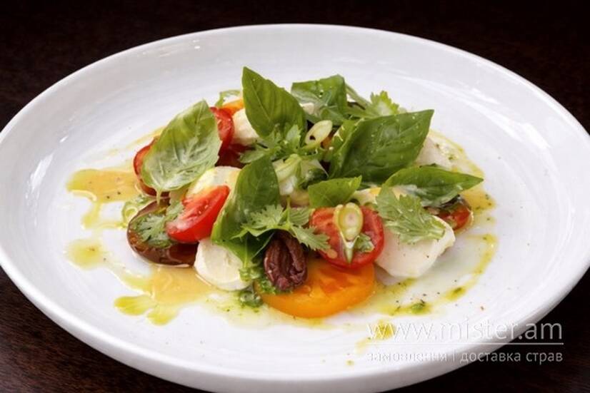 Томати два вида, черрі, моцарела, оливки, зелень, песто.
