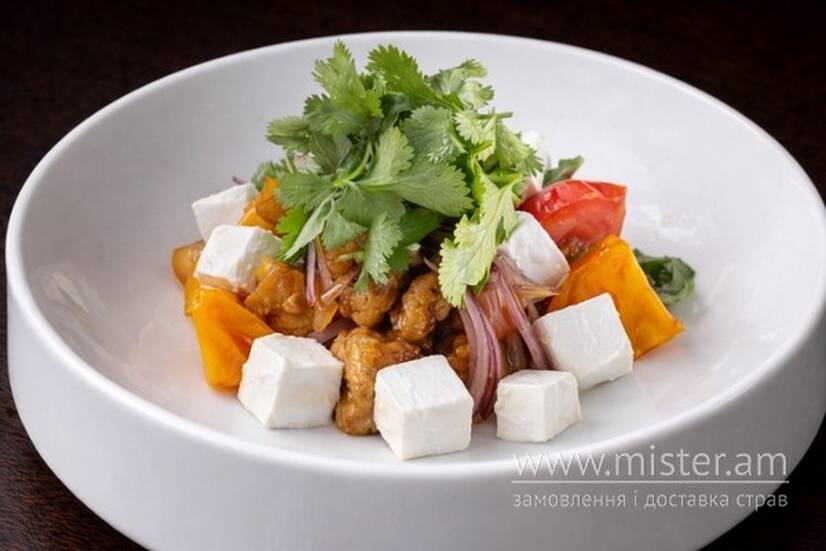 Баклажан фрі, свіжі томати, бринза, синя цибуля, кінза, оливкова олія, спеції, базилік.