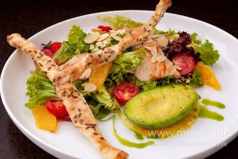 Філе індички, авокадо, помідори черрі, листя салату, мигдалева стружка, філе апельсина, грисині, медово-гірчичний соус.