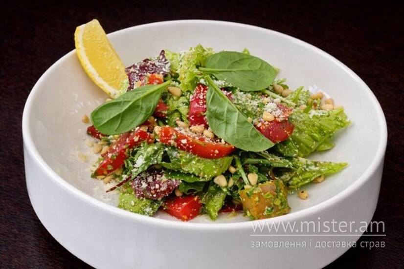 Лосось слабосолений, перець болгарський , огірки, лимон, мікс салату, пармезан, кедровий горіх, соус песто.