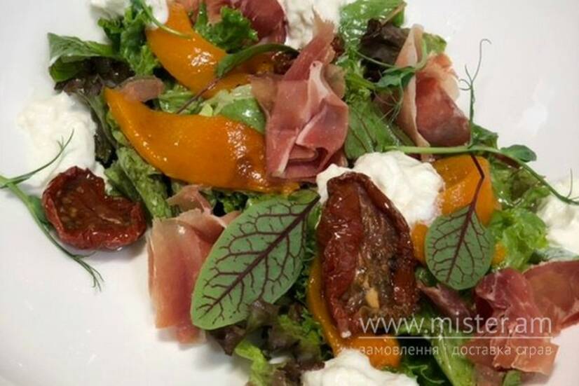 Прошуто, страчатела, помідори в'ялені, перець печений, листя салату.