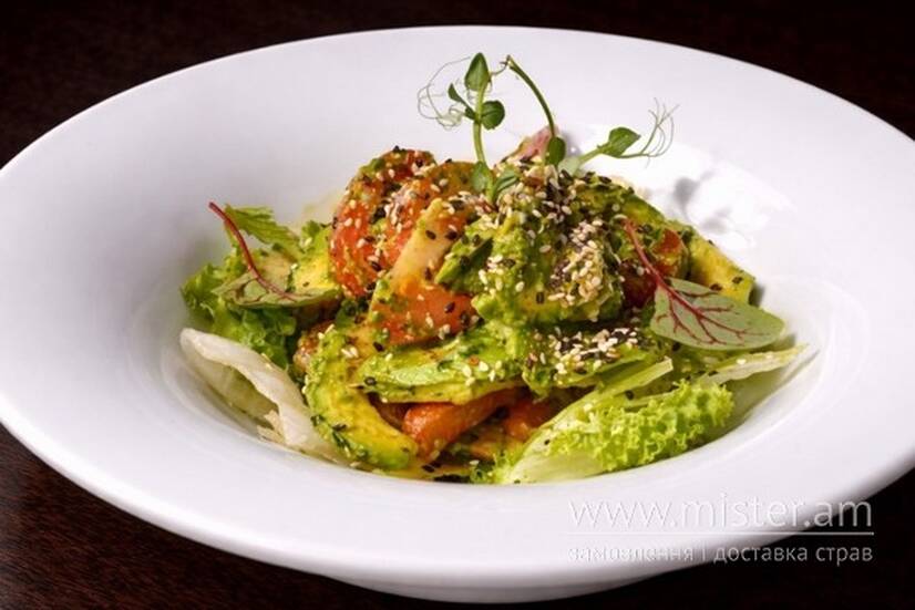 Томати, авокадо, листя салату, кунжут.