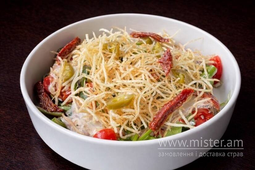 Вугор, перець печений, томати черрі, в'ялені томати, халапеньйо, картопля пай, зелень, заправка на основі горіхового соусу.
