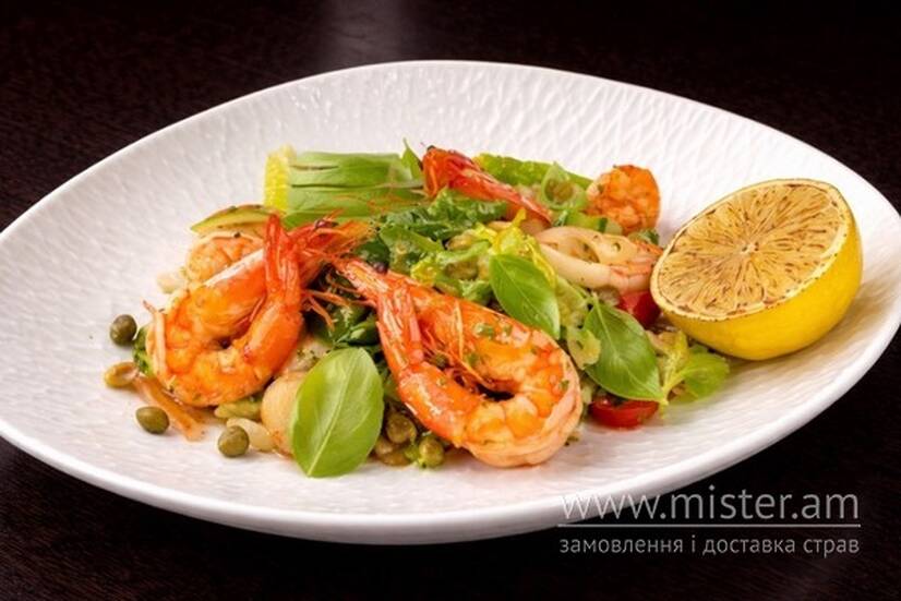 Гребінці, тигрова креветка, лангустін, кальмар, авокадо, черрі, огірки, каперси, зелень, лимон, соус на основі меду, вершкового масла, соєвого соусу та часнику.