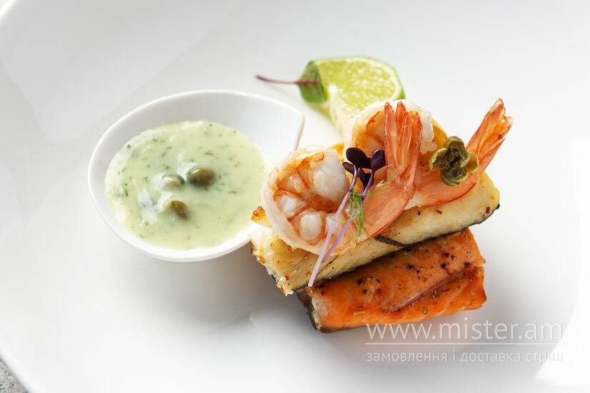 Смажене філе тріски та сьомги на мангалі та королівська креветка подається з лимоном.