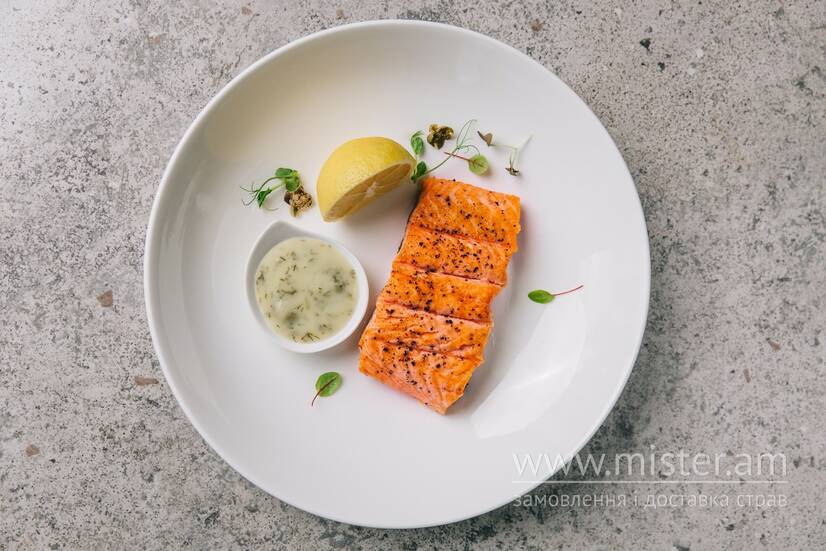 Ароматне філе смаженої сьомги на мангалі, подається з листям салату.