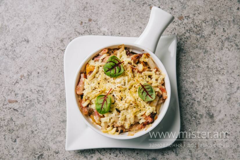 Смажена картопля зі шматочками бекону та розсольного сиру.