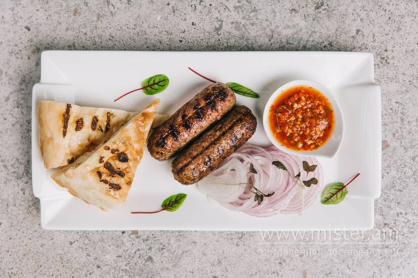 Турецький люля-кебаб з баранини та лавашем подається з цибулею, аджикою та свіжою зеленню.