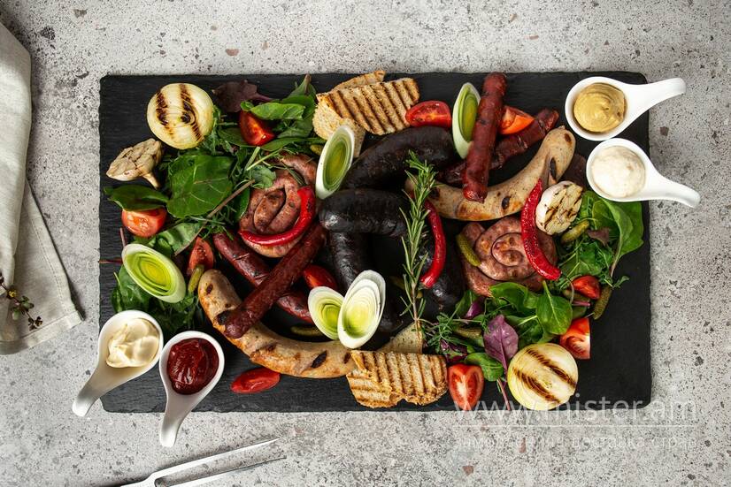 Смажені на грилі Мюнхенські ковбаски, Шашличні, Баварські з сиром, кров'янка та Українська смажена.