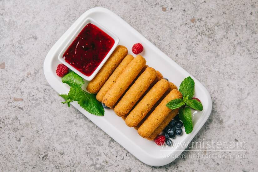 Хрусткі палички моцарелли, смажені у фритюрі, подаються з кисло-солодким ягідним соусом.