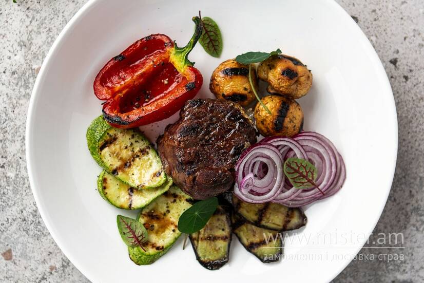 Смажені на грилі, сезонні овочі та запечене колінце телятини, помідори коктейльні, цибуля, петрушка, тим'ян, соус ворчестер.