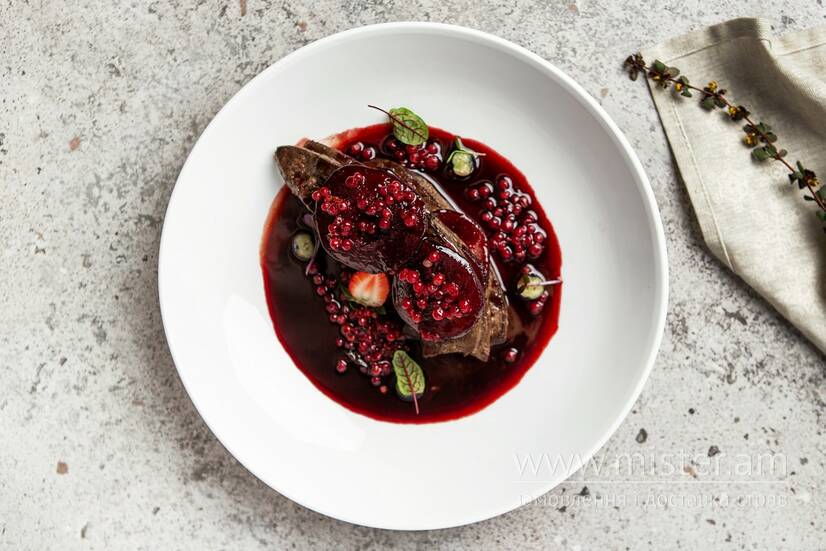 Ніжна яловича печінка з соусом на червоному вині з брусницею та грушею.