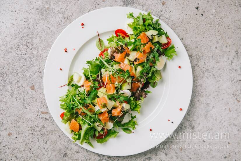 Рошпонка з свіжими огірками, помідорами, укропом, перепелиним яйцем та сьомгою, заправляється олією.