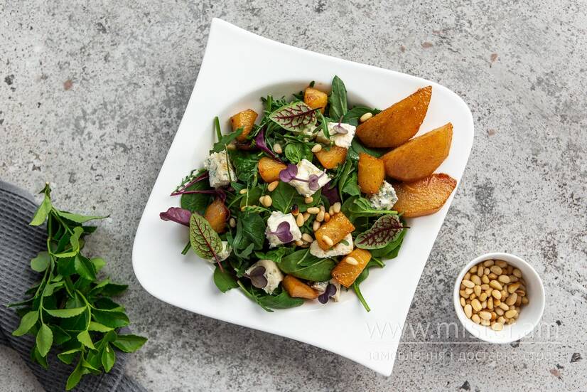 Салат з карамелізованою грушею, кедровим горіхом та сиром Горгондзола в модовій заправці.
