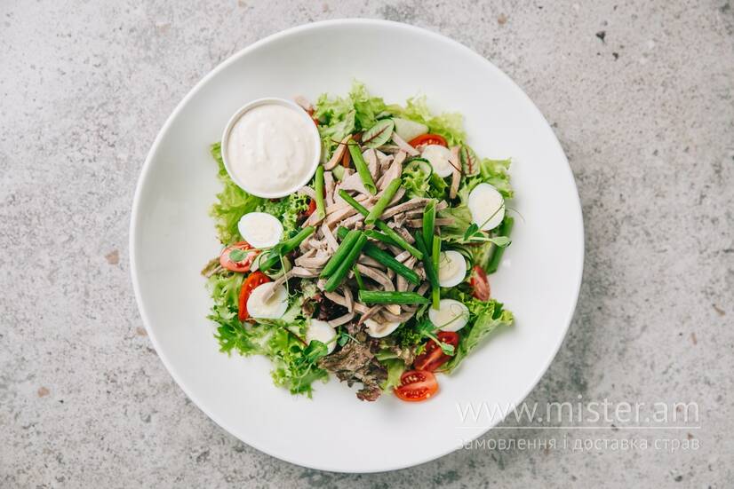 Листя салату з ніжним яловичим язиком, перепилиними яйцями, свіжим огірком, помідорами черрі з майонезом та хріном.