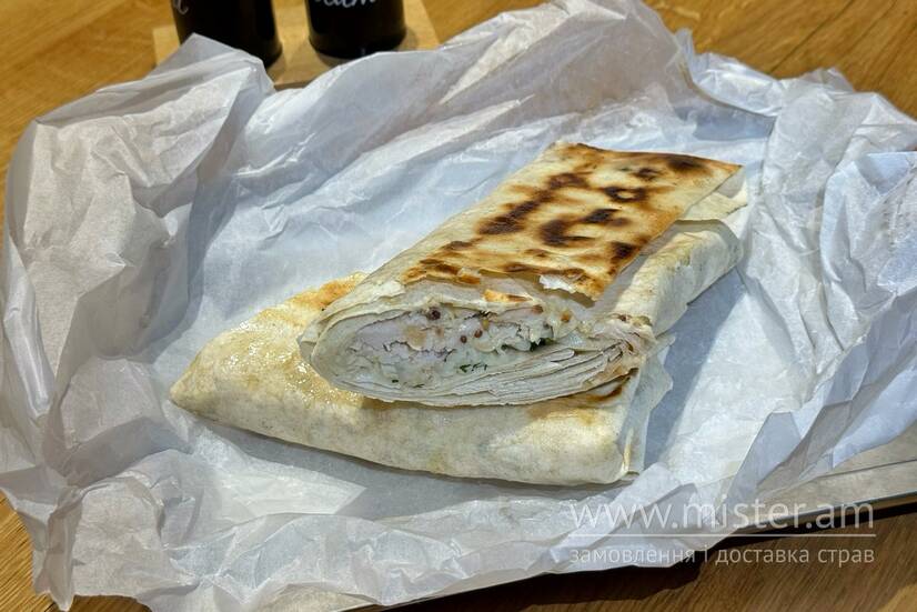 Лаваш, соус, курка, сир моцарелла, зелень.