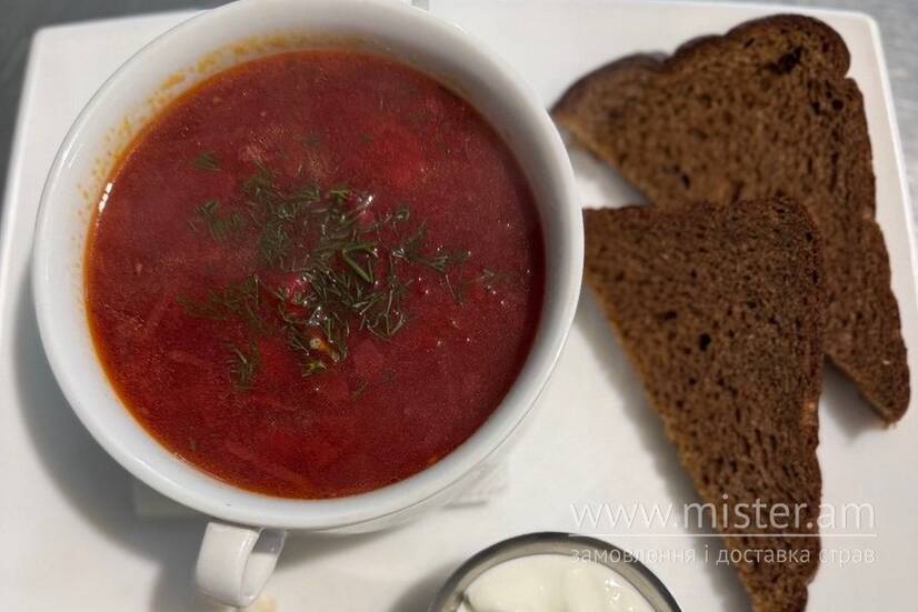 Бульйон свинний, мікс ковбас, картопля, морква, цибуля, томатна паста, аджика, маслина, лимон.