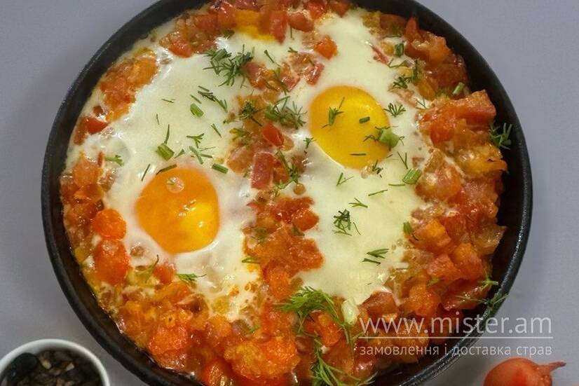 Тушкований перець болгарський, помідори, цибуля, часник, яйця.