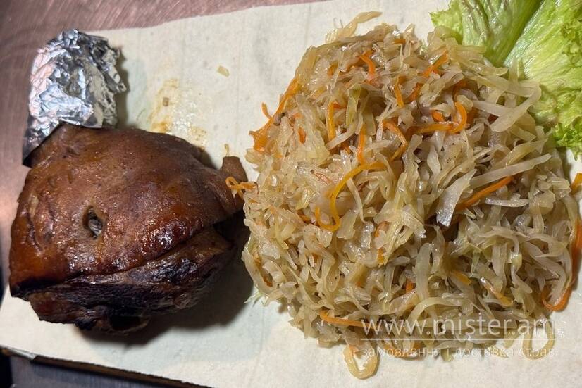 Рулька свинна, тушена капуста. Увага! Вагова страва, ціна вказана за 100 г, кінцеву вартість заклад узгодить з Вами по телефону.